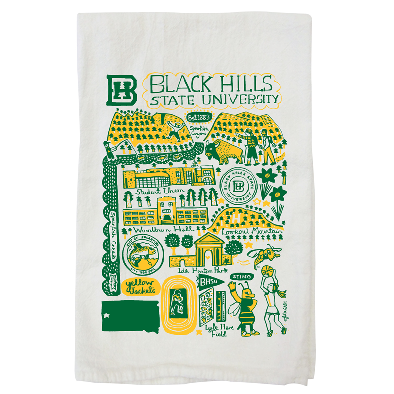 This is a kitchen towel (or tea towel) made by British artist Julia Gash. Julia's illustrations capture the character and culture of BHSU and Spearfish. Made of 100% Organic Cotton Measures about 27" x 27" Machine Washable & Dryer Safe